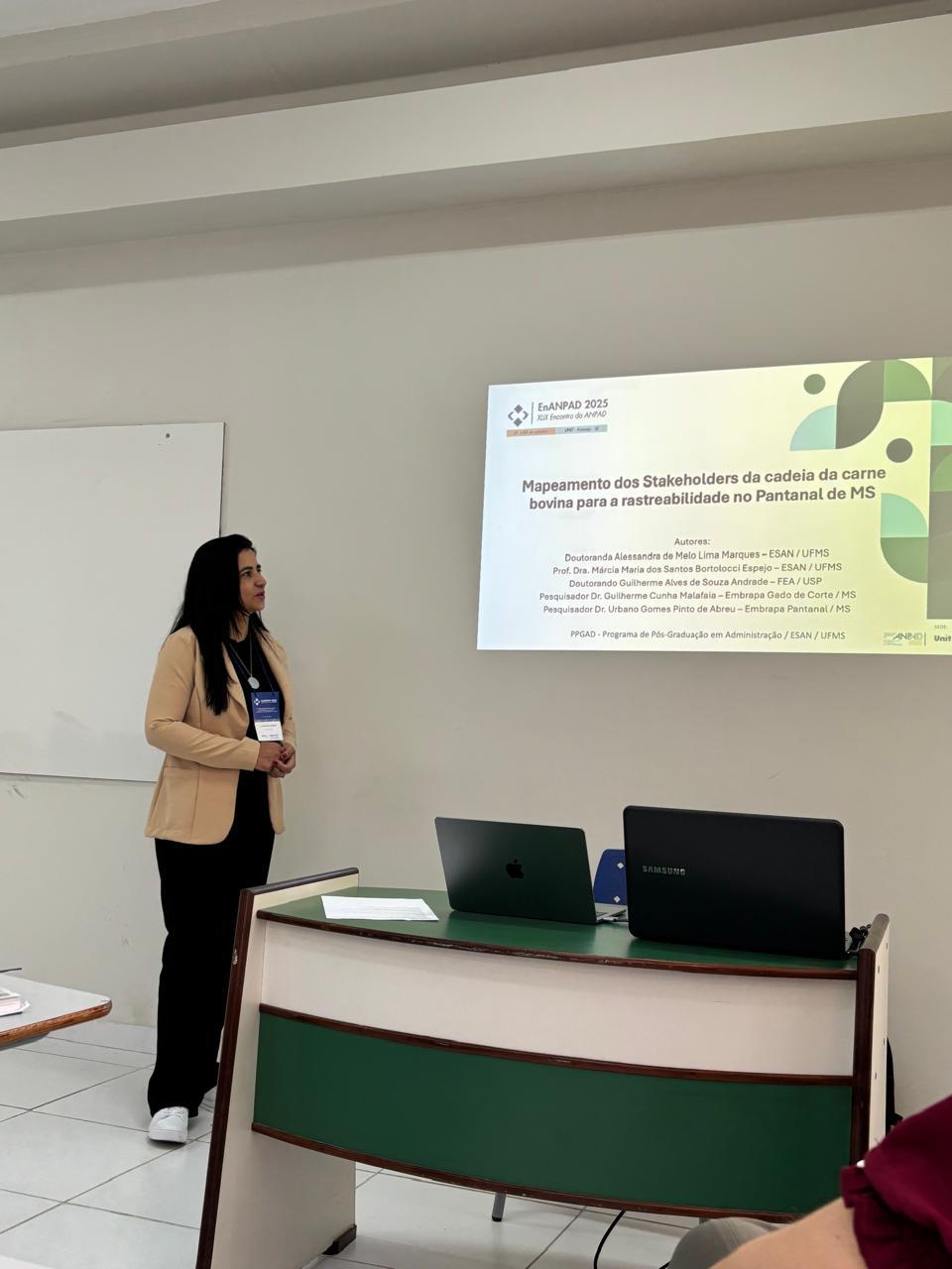 A estudante de doutorado em Administração da ESAN e egressa do curso de graduação em Administração da UFMS, Campus de Aquidauana, Alessandra de Melo Lima Marques, apresentou o trabalho intitulado “Mapeamento dos Stakeholders da cadeia da carne bovina para a rastreabilidade no Pantanal de MS”, no XLIX Encontro da ANPAD – EnANPAD 2025, na Universidade Tiradentes (UNIT), em Aracaju (SE).