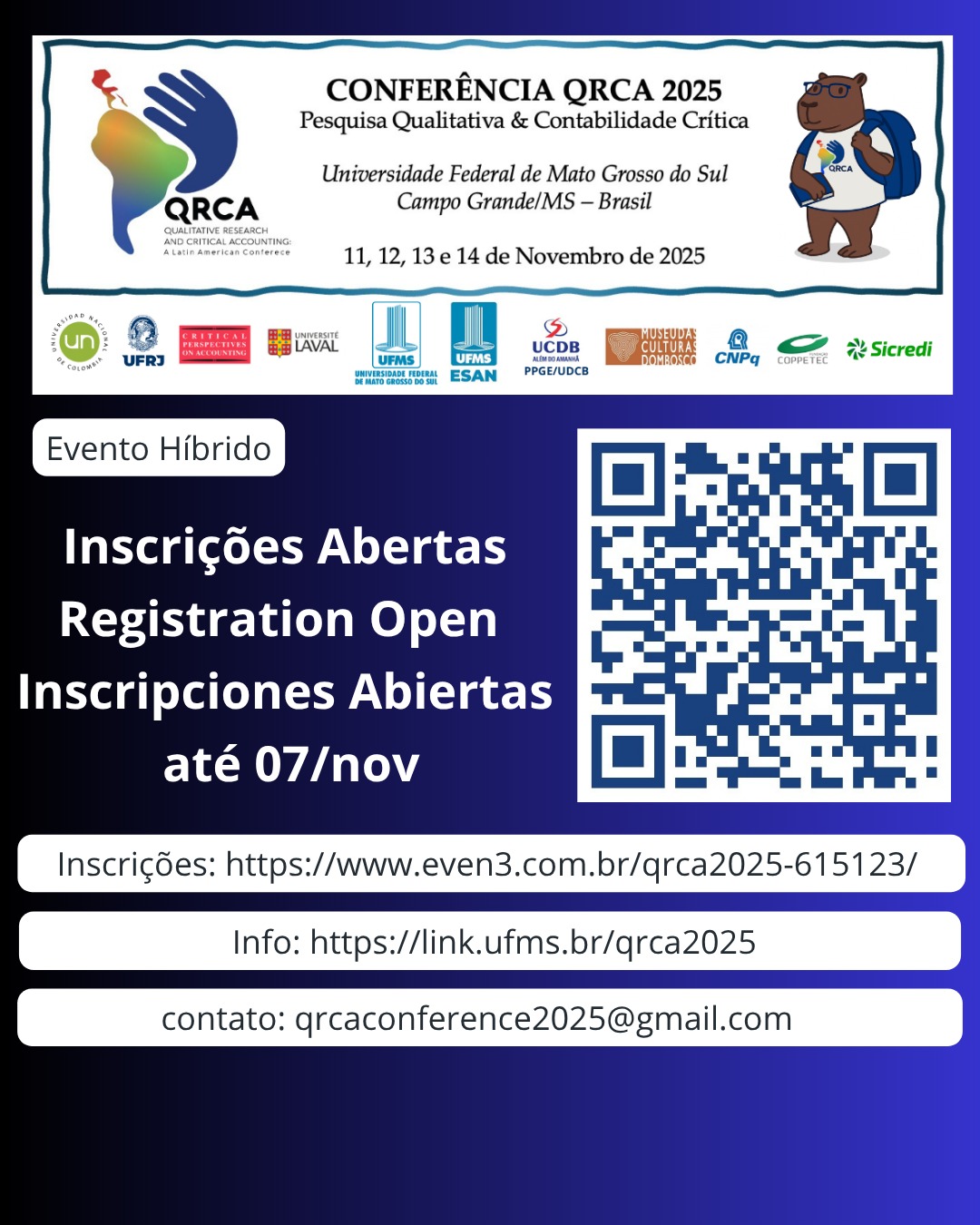 De 11 a 14 de novembro, será realizada na ESAN a Conferência “Pesquisa Qualitativa e Contabilidade Crítica”, em inglês, Qualitative Research and Critical Accounting (QRCA) 2025, com transmissão on-line e tradução simultânea das palestras.