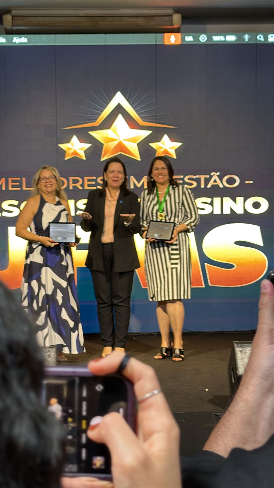 A coordenadora do projeto de extensão Tecnologias de Processos Gerenciais para Indivíduos, professora Camila Miranda também recebeu a medalha de honra ao mérito Selo Oficial da Excelência pela atuação como avaliadora do prêmio em 2025.