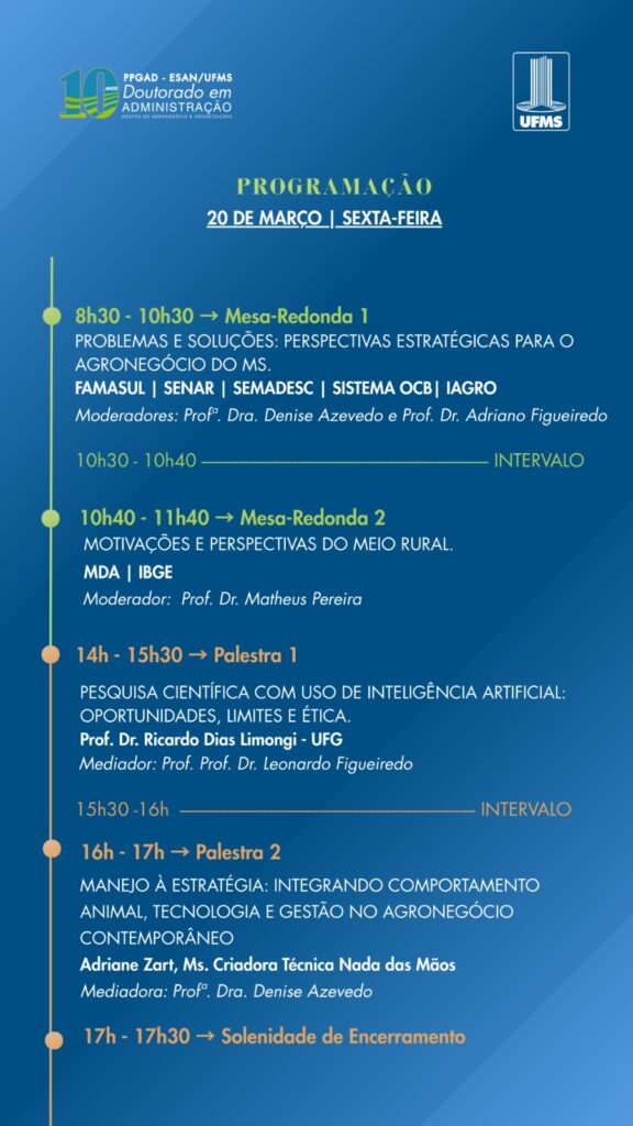 doutorado em administração, turma 2026, orientado do professor Matheus Wemerson, e palestrante na mesa-redonda no dia 20 de março, antecipa que “celebrar os 10 anos do doutorado em administração da ESAN é reconhecer uma década de impacto científico decisivo para Mato Grosso do Sul.”