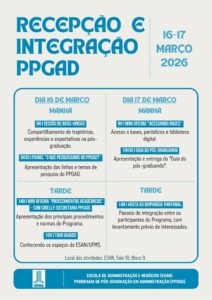 Nos dias 16 e 17 de março de 2026, o Programa de Pós-graduação em Administração (PPGAD) da ESAN dará as boas-vindas aos seus calouros e veteranos em um evento especial e inédito de recepção, Sala 10, Bloco 9, na ESAN.